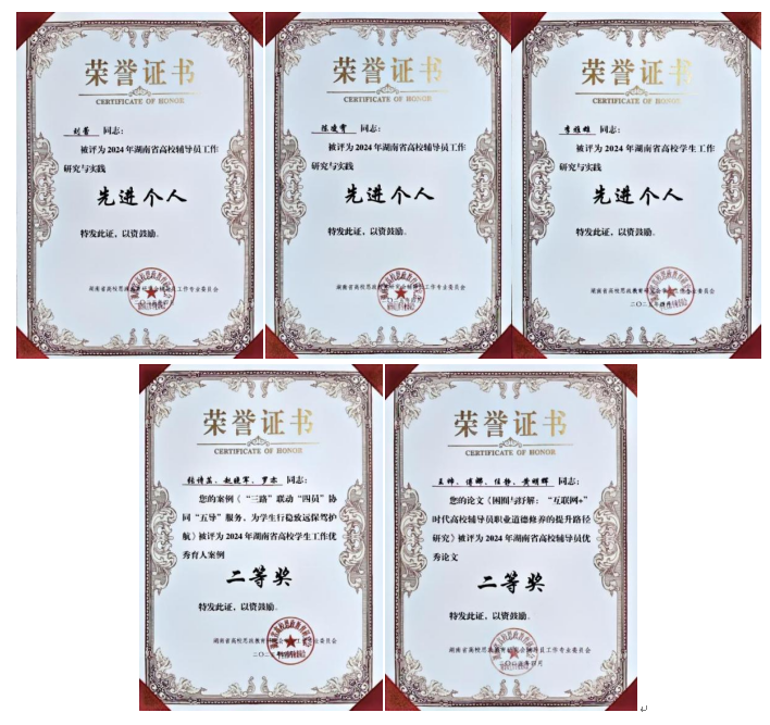 4月25日,湖南省高校辅导员工作专业委员会、湖南省高校学生工作专业委员2024年年会在湖南科技大学召开,会议对2024年全省高校辅导员工作研究与实践先进单位、先进个人、辅导员优秀论文、学生工作优秀育人案例等进行了表彰。我校获评“湖南省高校辅导员研究与实践先进单位”,辅导员刘蕾、陈凌霄获评“湖南省高校辅导员工作研究与实践先进个人”,学生工作部李雅雄获评“湖南省高校学生工作研究与实践先进个人”;辅导员王帅获“湖南省高校辅导员优秀论文二等奖”,张诗菡获评“湖南省高校学生工作优秀育人案例二等奖”。